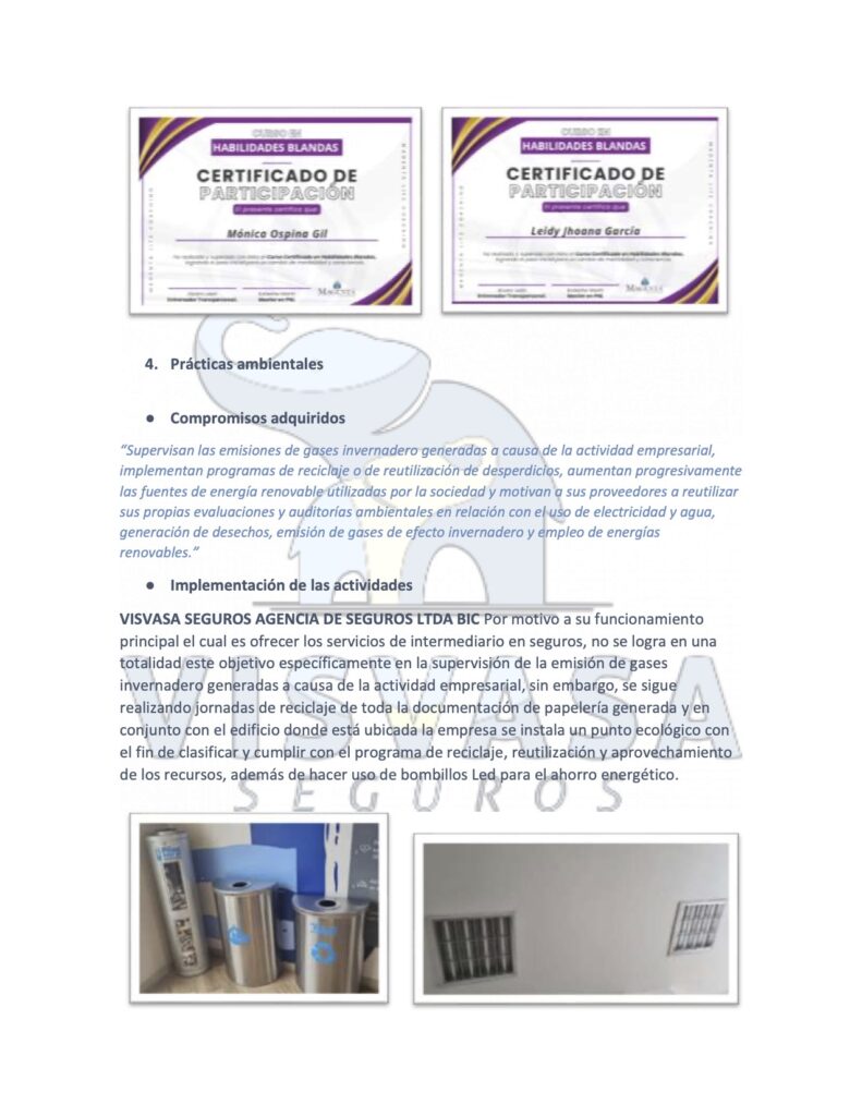 En este caso VISVASA SEGUROS AGENCIA DE SEGUROS LTDA BIC debido a su corto tiempo de creación no pudo lograr la totalidad de este objetivo específicamente en la supervisión de la emisión de gases invernadero generadas a causa de la actividad empresarial, sin embargo, se realizó jornada de reciclaje de toda la documentación de papelería generada y se instala punto ecológico con el fin de clasificar y cumplir con programa de reciclaje y reutilización, además de hacer uso de bombillos Led para el ahorro energético.