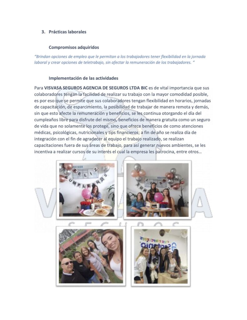 VISVASA SEGUROS AGENCIA DE SEGUROS LTDA BIC ofrece a sus colaboradores trabajar de manera remota y asistir a las instalaciones solo cuando su labor lo requiera, horario laboral es flexible, permitiendo capacitarse en otras áreas sin que esto afecte la remuneración y beneficios, e les otorga día del cumpleaños libre para disfrute del mismo, adicional a lo establecido por la ley se les da como beneficio de manera gratuita un seguro de vida que no solamente los protege, sino que ofrece beneficios de como atenciones médicas, psicológicas, nutricionales y tips financieros; a fin de año se realiza día de integración con el fin de agradecer al equipo el trabajo realizado.